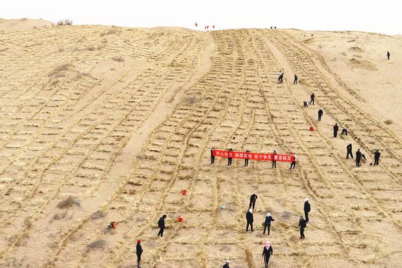 “壓沙前,先要在沙丘上按設(shè)置方向、間距或網(wǎng)格劃好設(shè)置線。背風(fēng)坡,壓豎道;迎風(fēng)坡,就要橫豎格子全壓。先開(kāi)寬25厘米、深20厘米的沙溝,將稻草在沙溝上均勻無(wú)間斷鋪好,再將沙子壓實(shí)在稻草中間,將兩邊翹起的稻草用沙淤起與沙面垂直,扶成“雙眉式”……大家仔細(xì)聆聽(tīng)了區(qū)林草局技術(shù)人員的詳細(xì)講解和指導(dǎo)后,很快掌握了規(guī)范的壓沙方法和要求,各小組迅速投入到熱火朝天的防沙壓沙活動(dòng)中。