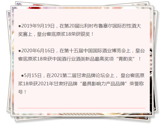 在2021第二屆甘肅品牌論壇會(huì)上,皇臺(tái)窖底原漿18榮獲2021年甘肅好品牌“最具影響力產(chǎn)品品牌”榮譽(yù)稱號(hào)!這是皇臺(tái)窖底原漿18榮獲第20屆比利時(shí)布魯塞爾國(guó)際烈性酒大獎(jiǎng)賽銀獎(jiǎng)、榮獲中國(guó)酒行業(yè)酒類新品最高獎(jiǎng)項(xiàng)“青酌獎(jiǎng)”之后,再一次斬獲的榮譽(yù)!