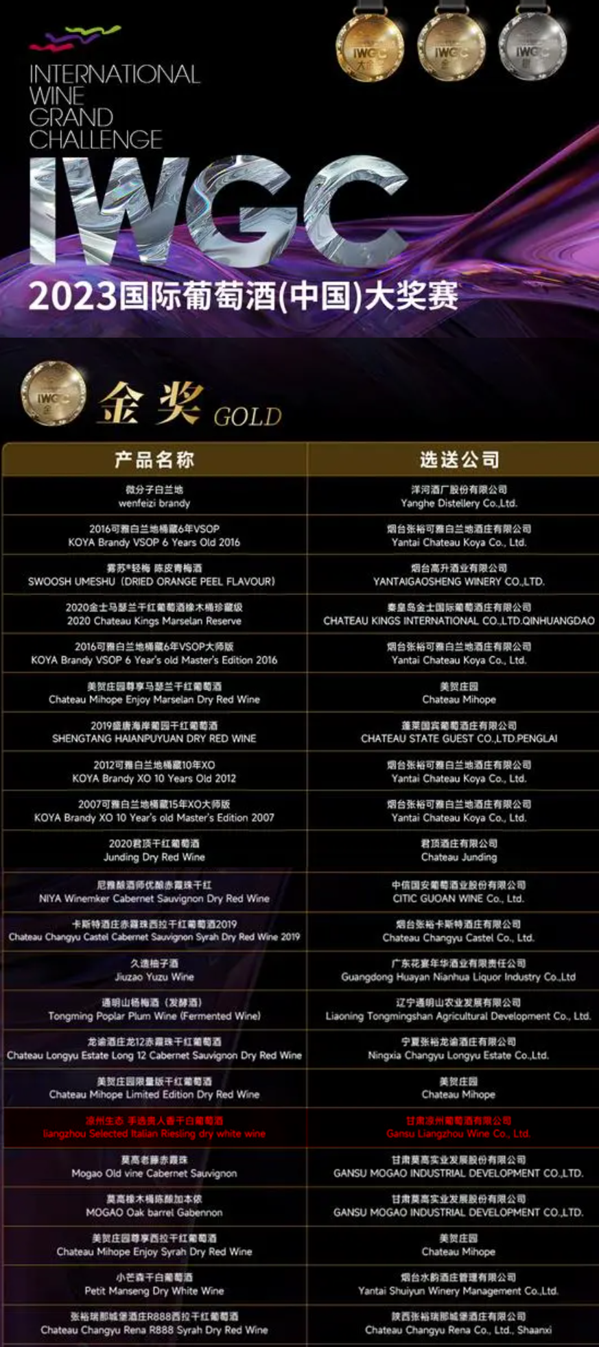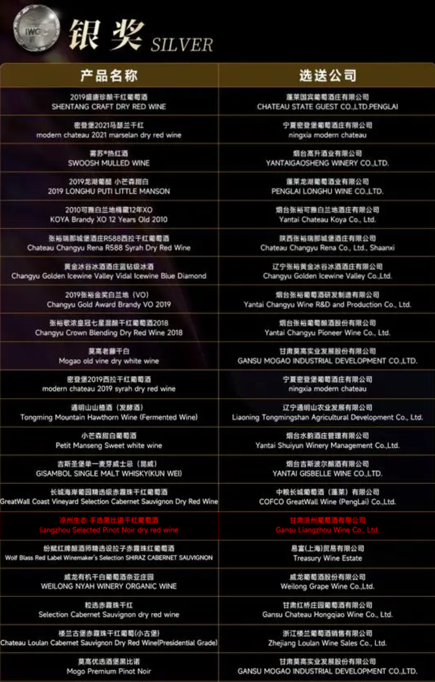 11月18日,2023IWGC國際葡萄酒(中國)大獎賽頒獎儀式在海南·??趪H會展中心隆重舉行。IWGC國際葡萄酒(中國)大獎賽匯聚國內(nèi)外酒款,參賽企業(yè)覆蓋國內(nèi)17個省份和法國、德國、澳大利亞、智利等多個國家的優(yōu)質(zhì)產(chǎn)區(qū),參評產(chǎn)品達到537款,包含葡萄酒、白蘭地、威士忌、果酒、配制酒、露酒六個品類。在此次大賽上,皇臺酒業(yè)旗下的甘肅涼州葡萄酒有限公司所生產(chǎn)的“涼州生態(tài)·手選貴人香干白葡萄酒”和“涼州生態(tài)·手選黑比諾干紅葡萄酒”,以優(yōu)異的品質(zhì)在激烈的角逐中脫穎而出,分別斬獲了金獎和銀獎。