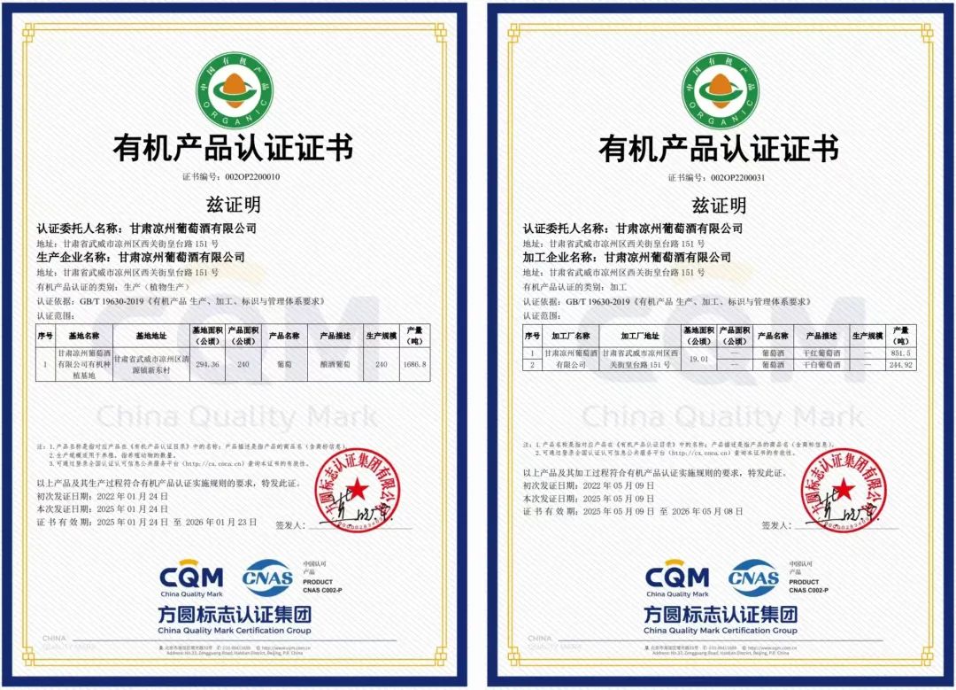 2024年11月,甘肅皇臺(tái)酒業(yè)股份有限公司旗下的甘肅涼州葡萄酒有限公司及其葡萄種植基地,經(jīng)過(guò)權(quán)威認(rèn)證中心的嚴(yán)格審查和評(píng)估,雙雙通過(guò)了有機(jī)產(chǎn)品認(rèn)證。此雙證書(shū)的獲得,證明了甘肅涼州葡萄酒有限公司及其種植基地在有機(jī)種植和葡萄酒生產(chǎn)方面的突出表現(xiàn),更標(biāo)志著皇臺(tái)酒業(yè)在這一領(lǐng)域達(dá)到了國(guó)際有機(jī)產(chǎn)品標(biāo)準(zhǔn)的高度。