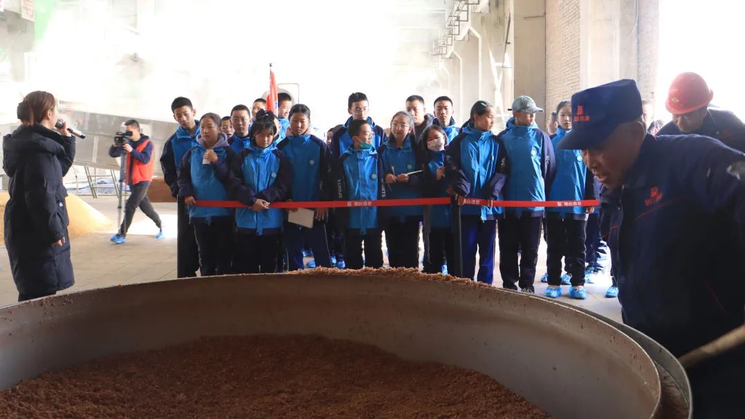 在白酒釀造車間,師生們近距離地觀察了從原料篩選、釀造、發(fā)酵到蒸餾的整個(gè)釀酒工藝流程。同學(xué)們聚精會(huì)神地聆聽,對(duì)白酒蒸餾與發(fā)酵這一概念有了更為直觀和深刻的理解。