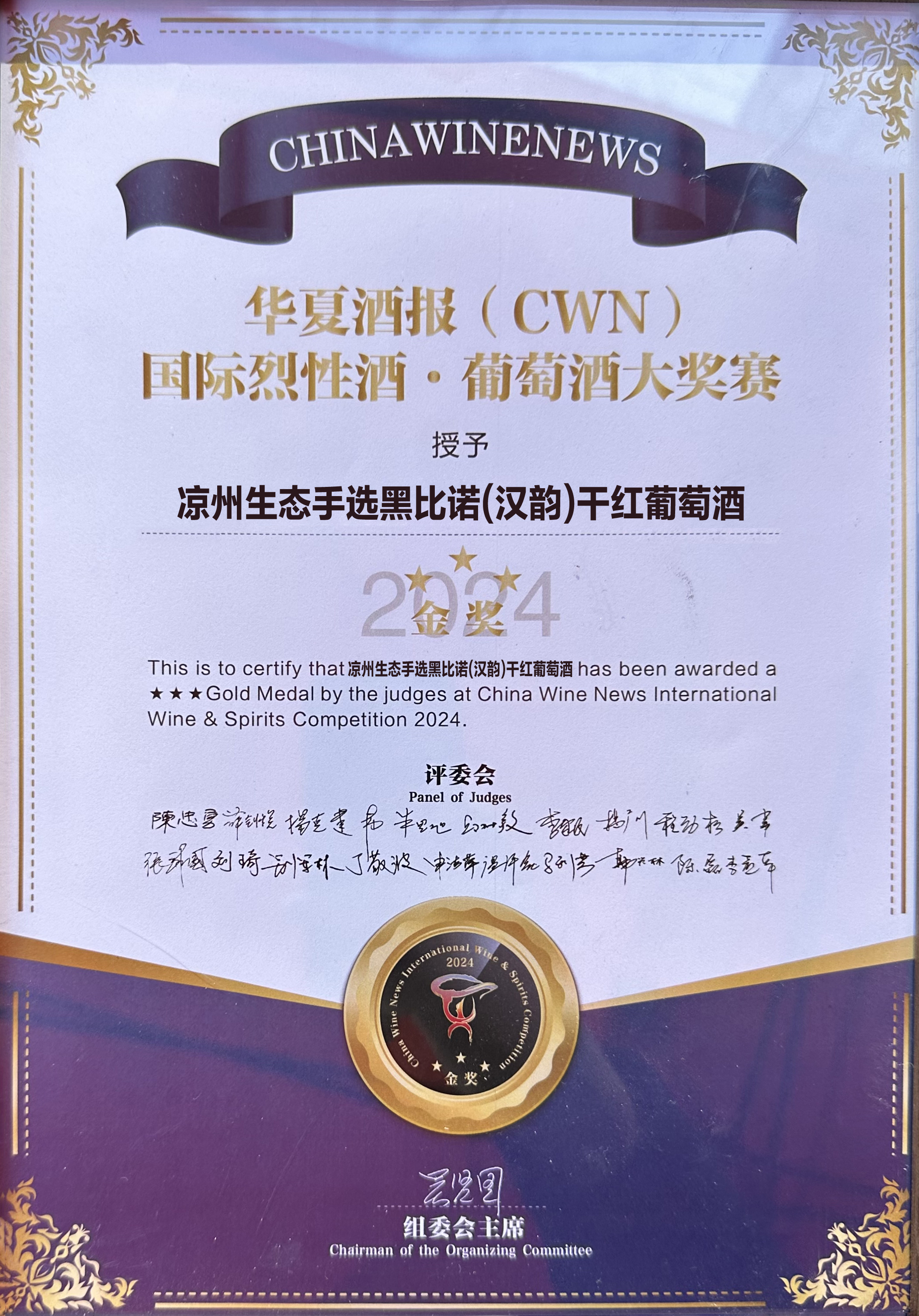 涼州生態(tài)手選貴人香(漢彩)干白葡萄酒和涼州生態(tài)手選黑比諾(漢韻)干紅葡萄酒,憑借其優(yōu)異的品質,在第二屆CWN國際烈性酒·葡萄酒大獎賽上,榮捧B類(價格在200—499元組)金獎。