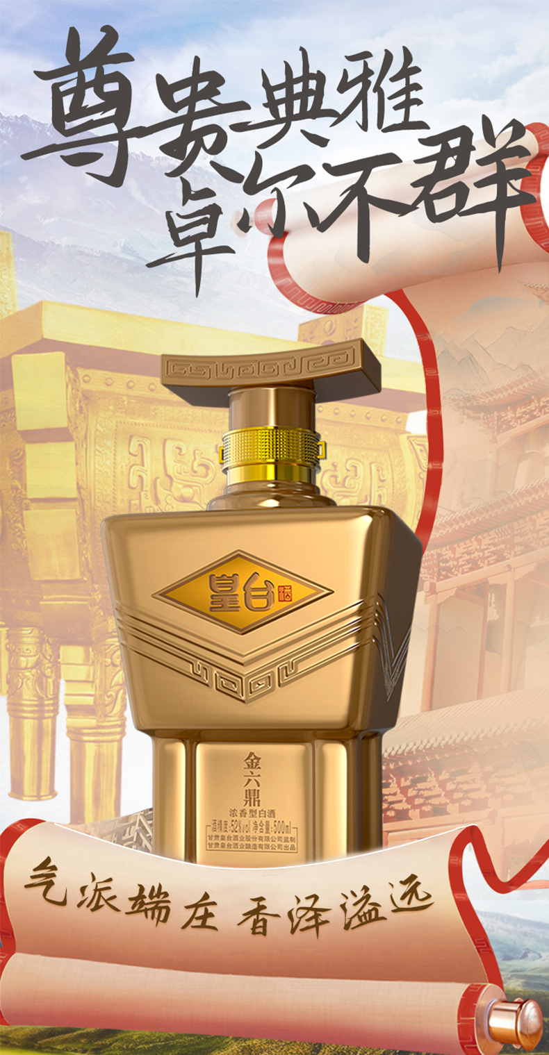 品名:皇臺酒52度金六鼎濃香型純糧食釀造白酒送禮500ml瓶禮盒裝